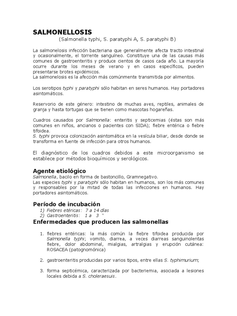 Patients affected by typhoid fever produce antibodies against the antigens of salmonella bacteria. Enteric infections due to salmonella bacteria are generally referred to by the term 'salmonellosis' when they are due to salmonella species other than salmonella typhi and salmonella paratyphi. Ser positivos en la primera semana en el 90% de los casos El hombre es el único reservorio y la fuente de infección, esté enfermo o sea portador. Cualquier alimento puede estar infectado por la bacteria salmonella , si es manipulado por una persona infectada con las manos sucias o si el alimento entra en contacto con otros que están los síntomas pueden comenzar entre las 6 y 72 horas después de la ingesta de salmonella.